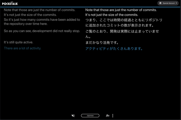 リアルタイム文字起こしも Web から見られた。一瞬集中がそれて聞き逃したときもすぐに話が理解できてとてもよい体験だった。